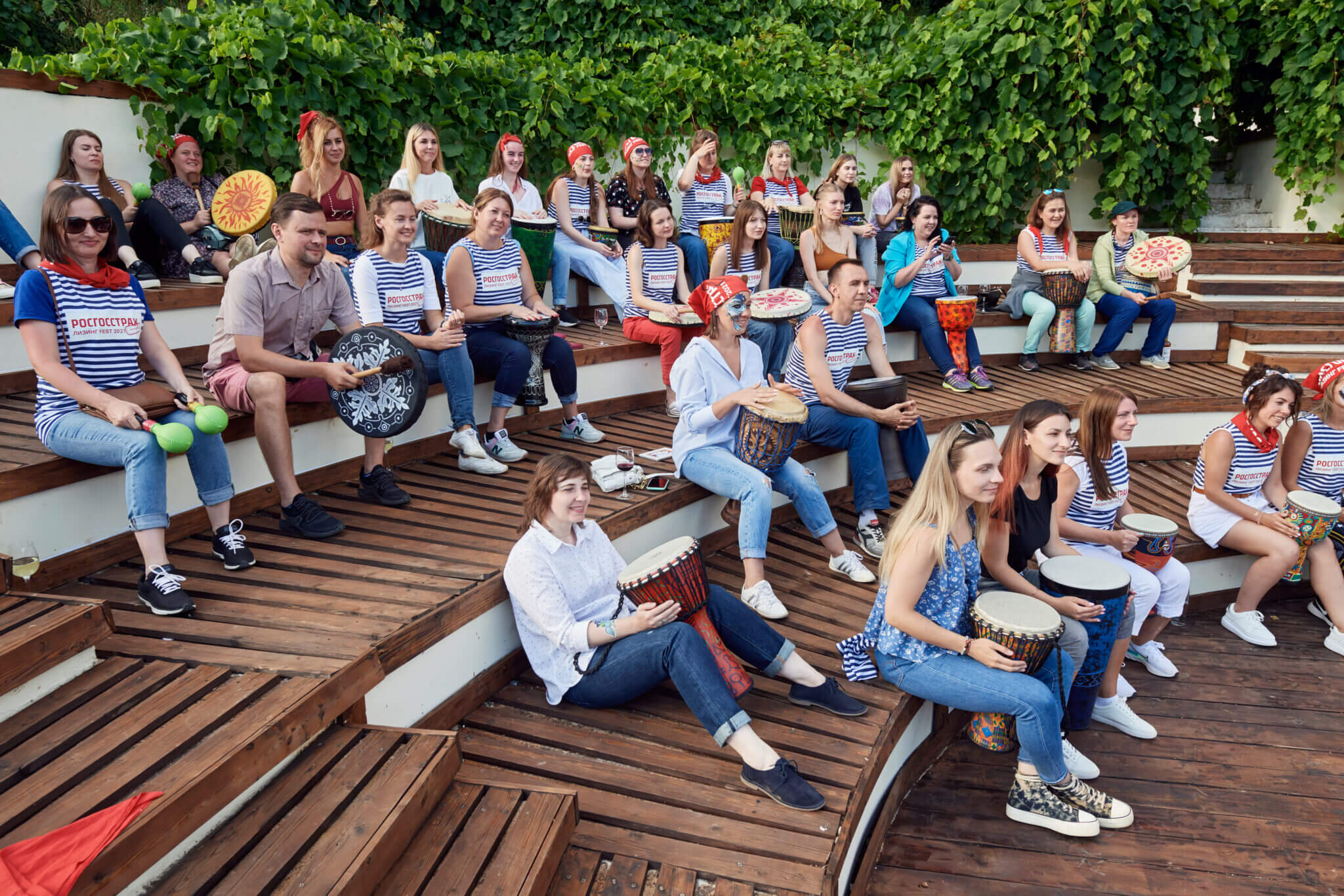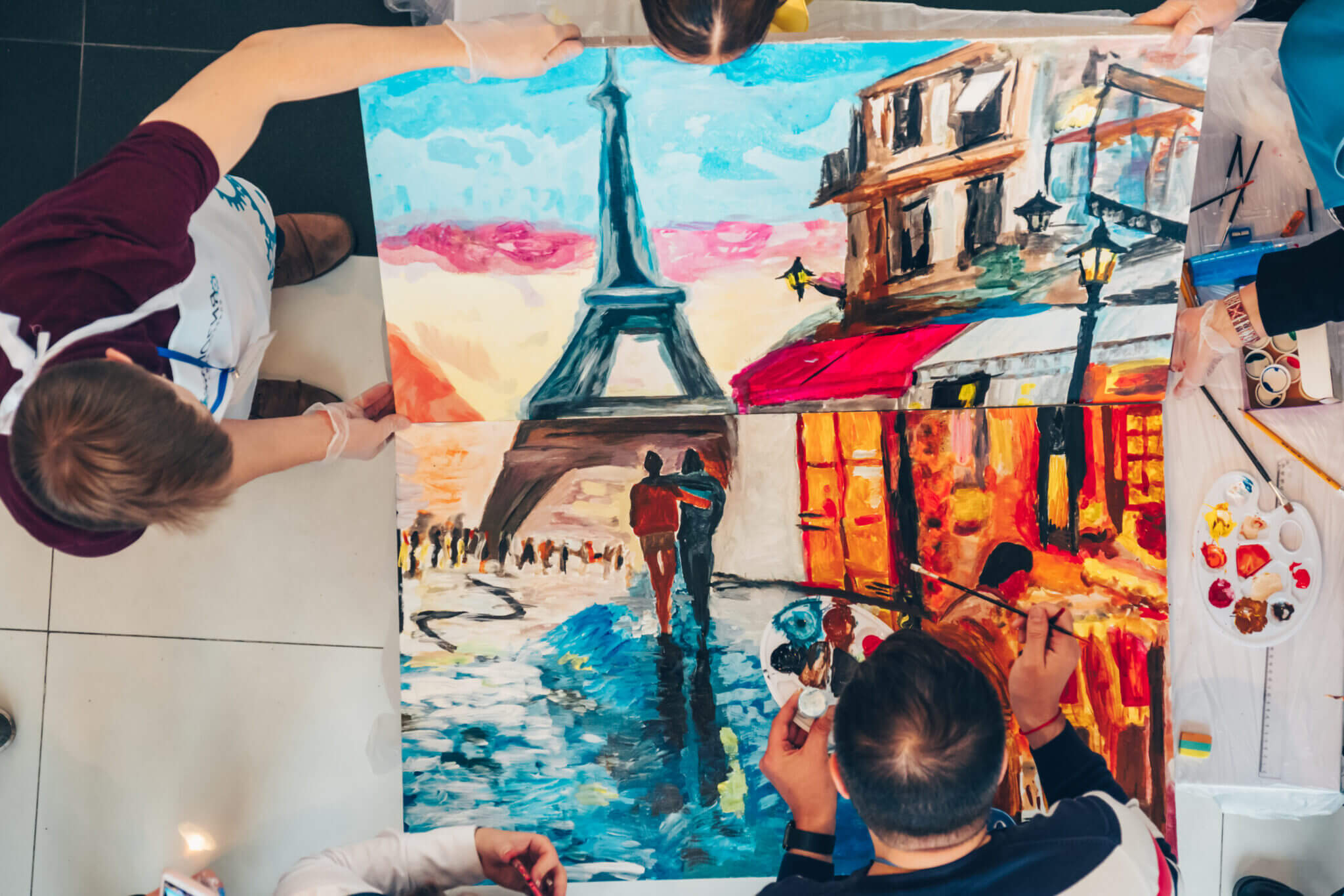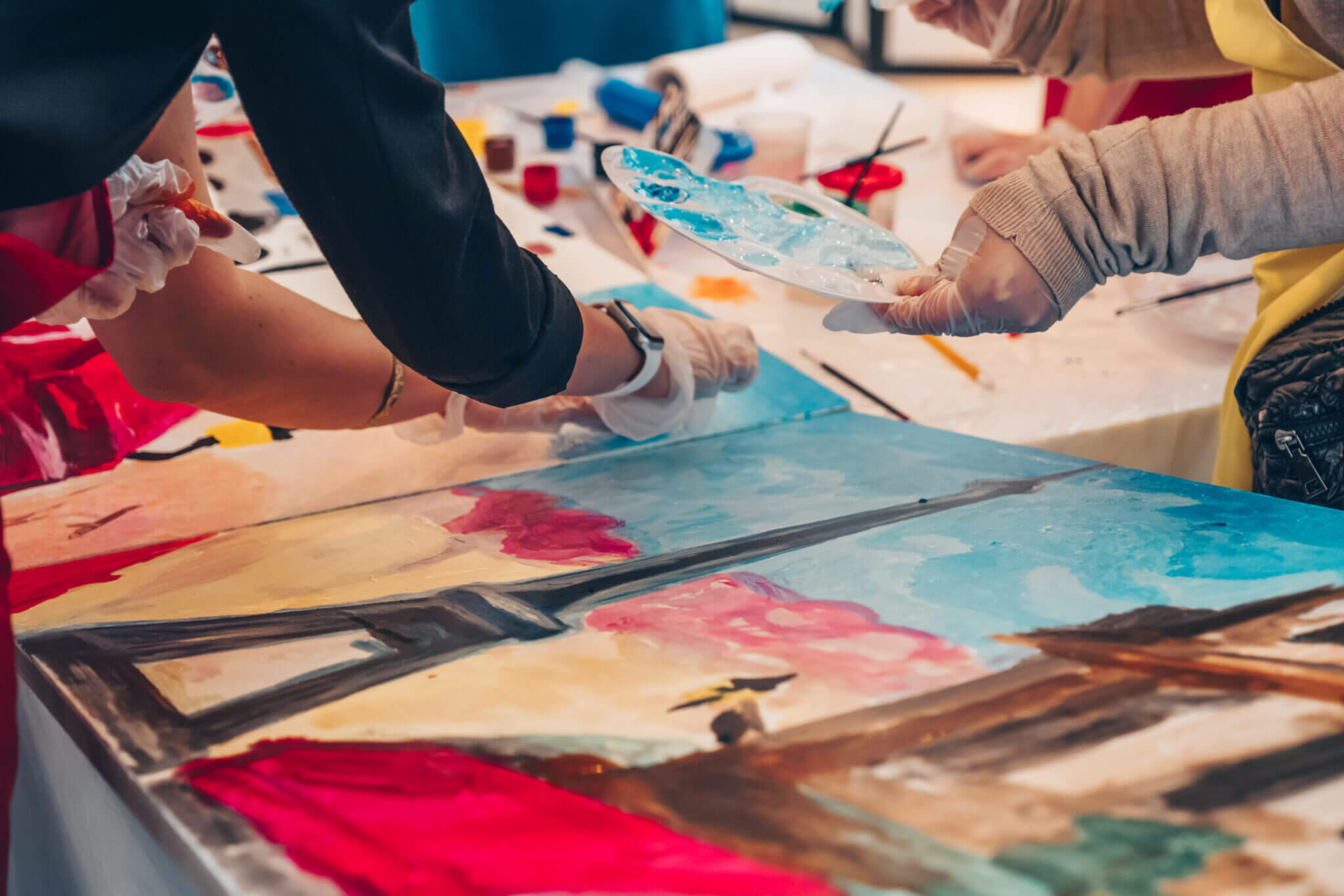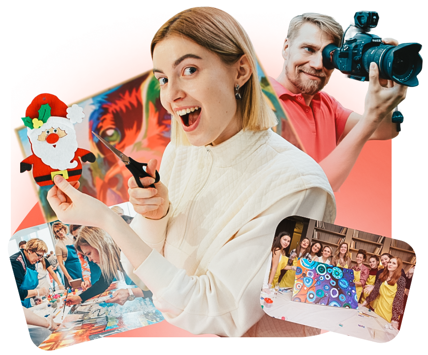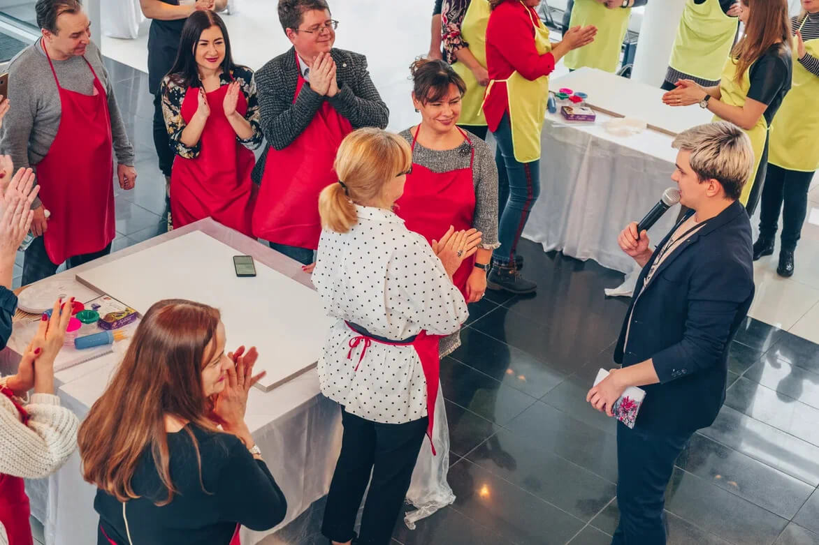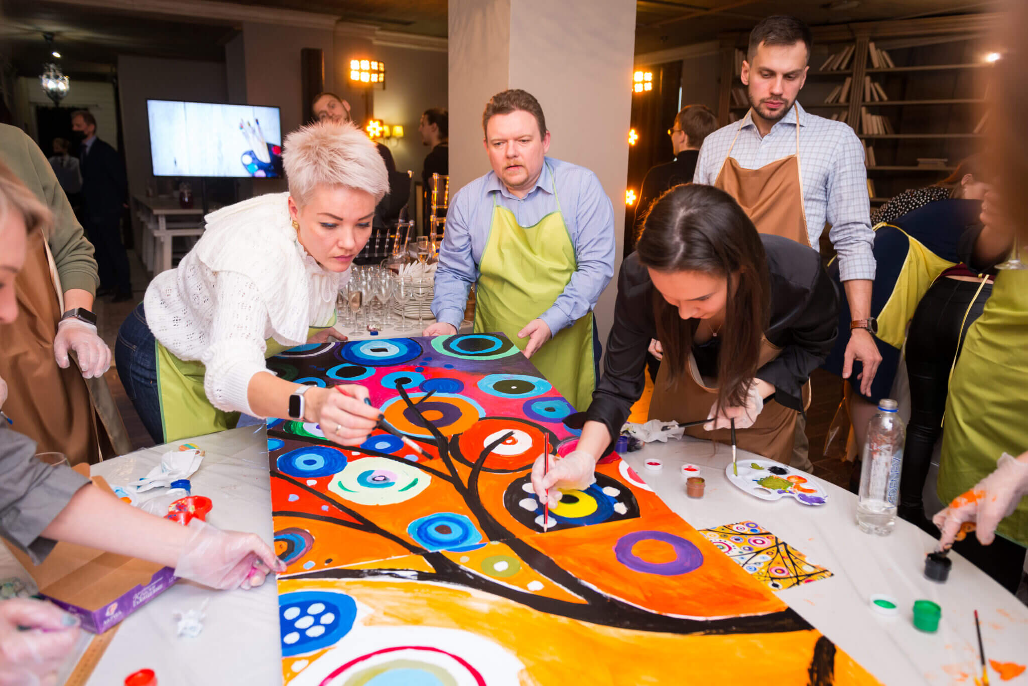 Для праздника мы выбрали тему дня — художественная галерея. Стены были украшены портретами сотрудниц, потолок — шарами, а на столах женскую часть коллектива ожидали краски. Мы разделили дам на 15 команд и выдали по фрагменту, который им нужно было воспроизвести на своих полотнах. Через полтора часа у на